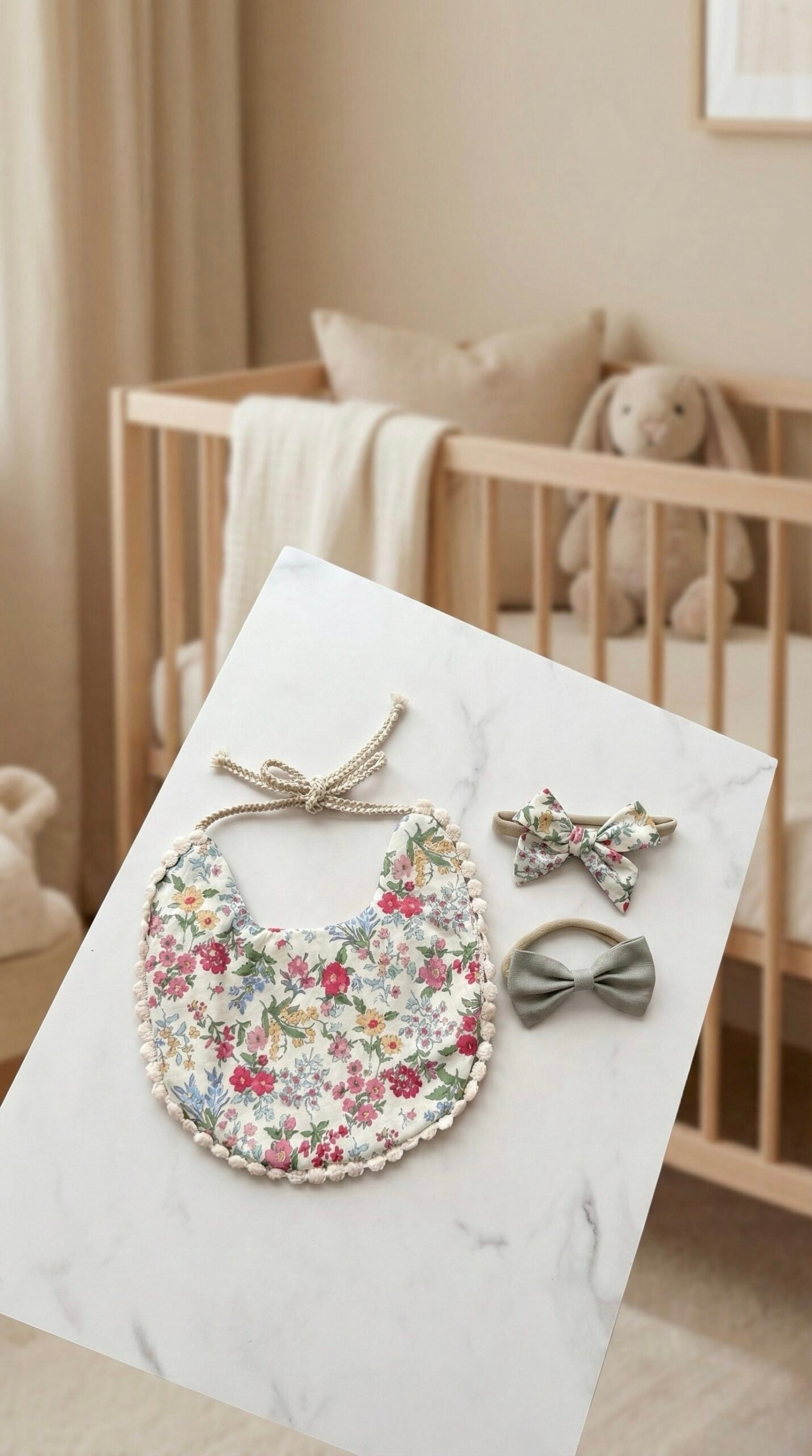 طقم أنيق مكوّن من صدريّة وقطعتين باند شعر بتصميم ناعم يناسب إطلالات المواليد اليومية أو جلسات التصوير.