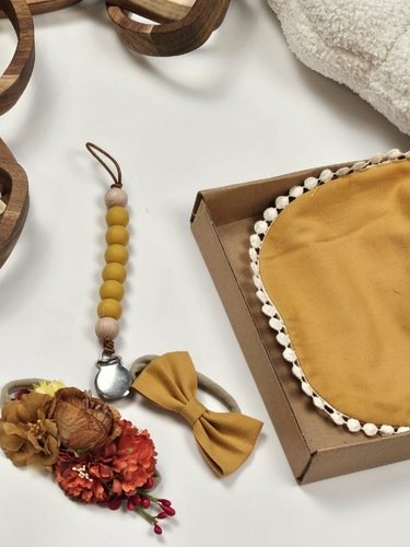 بوكس يحتوي على ٤ اشياء:-صدريه مصنوعه من القطن العضوي ١٠٠٪؜حامل لهايه بيبي ٢ باند شعر بتصميمين مختلفين